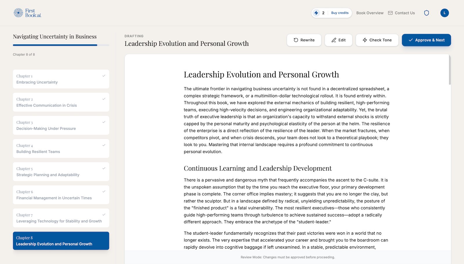 We generate an 8-chapter book structure with strategic intent behind every section. Review it, edit it, make it yours — then approve to start writing.
